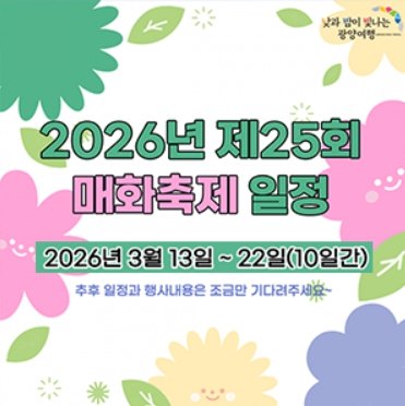 * 공지 사항 2026년 25회 광양매화축제 일정이 확정이 되었습니다. (2월 6일(금)- 광양시청 홈페이지) - 축제 기간: 2026년 3월 13일(금)~22일(일) - 예정일정 변경 안내는 2월9일(월)에 일괄적으로 안내 드릴 예정입니다. 2월 9일 이후에 예약하신 분께서는 공지사항과 아래 일정을 자세히 봐주시기 바랍니다. - 매화축제와 별개로 3/7(토)~22일(일) 광양/남원 여행은 별개로 20명 이상 모객 시, 여행은 확정됩니다. (꽃의 개화시기는 신문이나 매스컴, 보도자료 등을 통해 적절하게 판단하시기 바랍니다.)